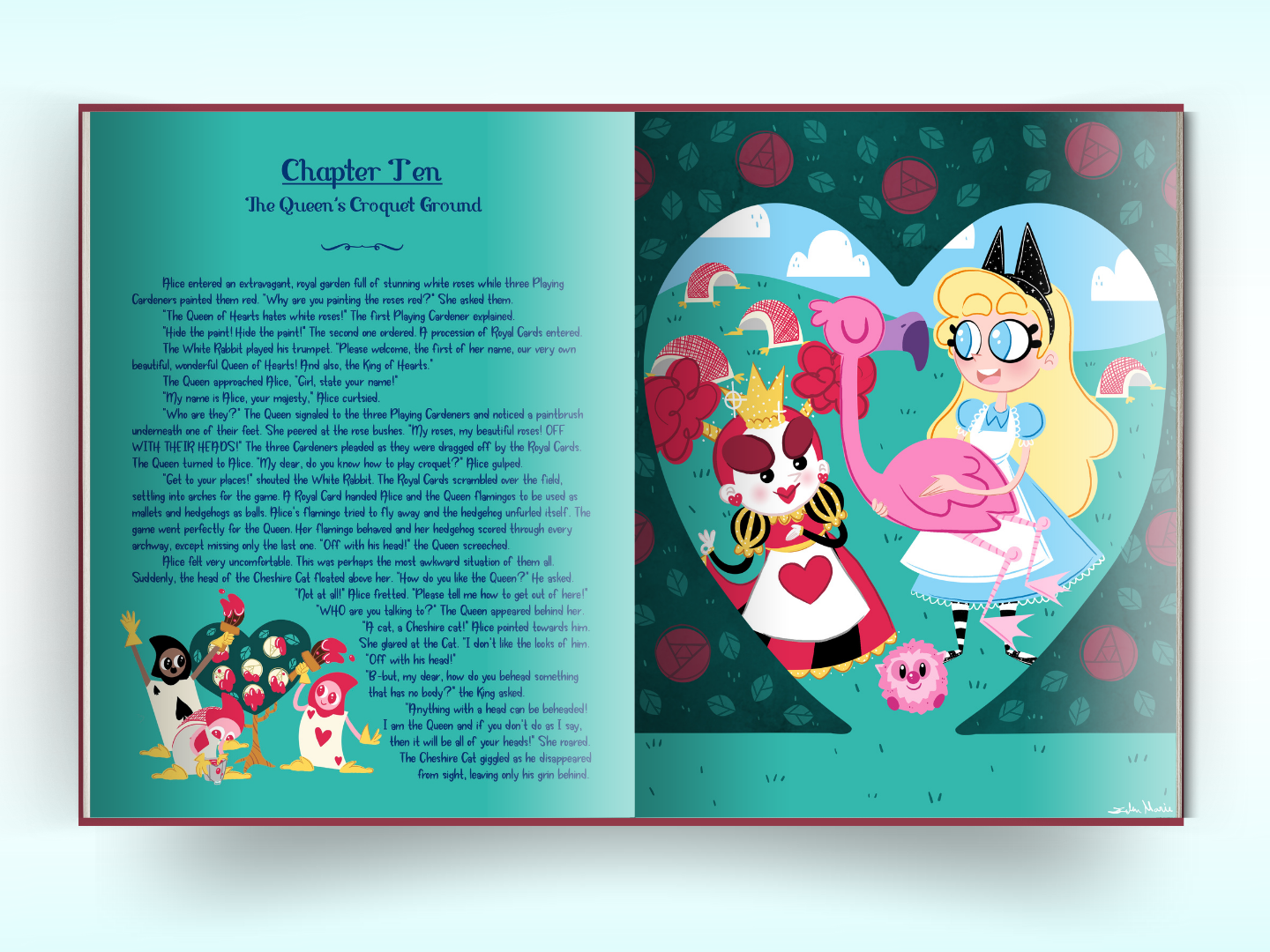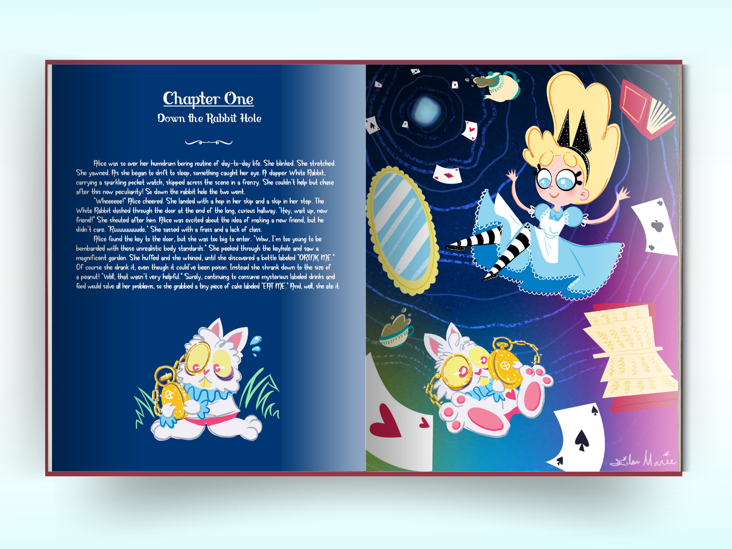 Creator of Alice's Adventures in Wonderland (32 pages), a sassy, modern adaptation of Lewis Carroll's classic tale, bringing Alice, whimsical characters, and fantastical adventures to life for kids ages 6–10. Illustrated with 14 full-color illustrations and 14 spot illustrations in a vibrant, playful style that captures humor, curiosity, and mischief. From character design, chapter illustrations, and book layout to overall visual storytelling, I art directed the entire project, ensuring a cohesive and engaging reading experience.